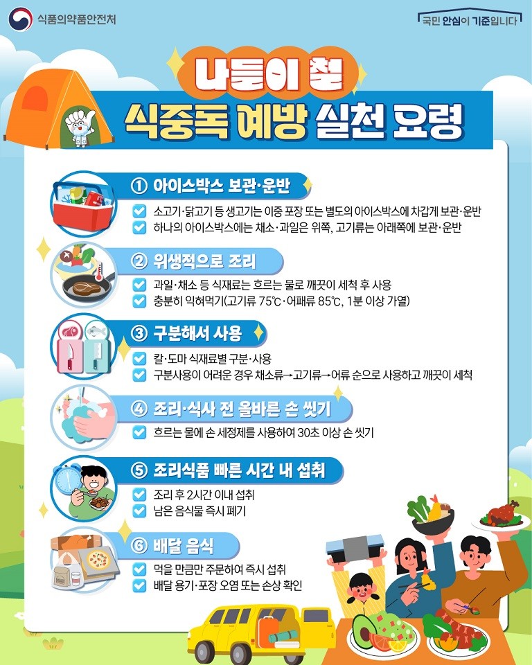 가을철은 일교차가 크고 식중독 발생 가능성이 높은 시기로, 살모넬라균과 병원성대장균 감염 우려가 높다. 이를 예방하기 위해 육류는 75℃ 이상에서 충분히 익히고, 채소류는 물로 3회 이상 세척하는 등 조리과정에서 주의가 필요하다.