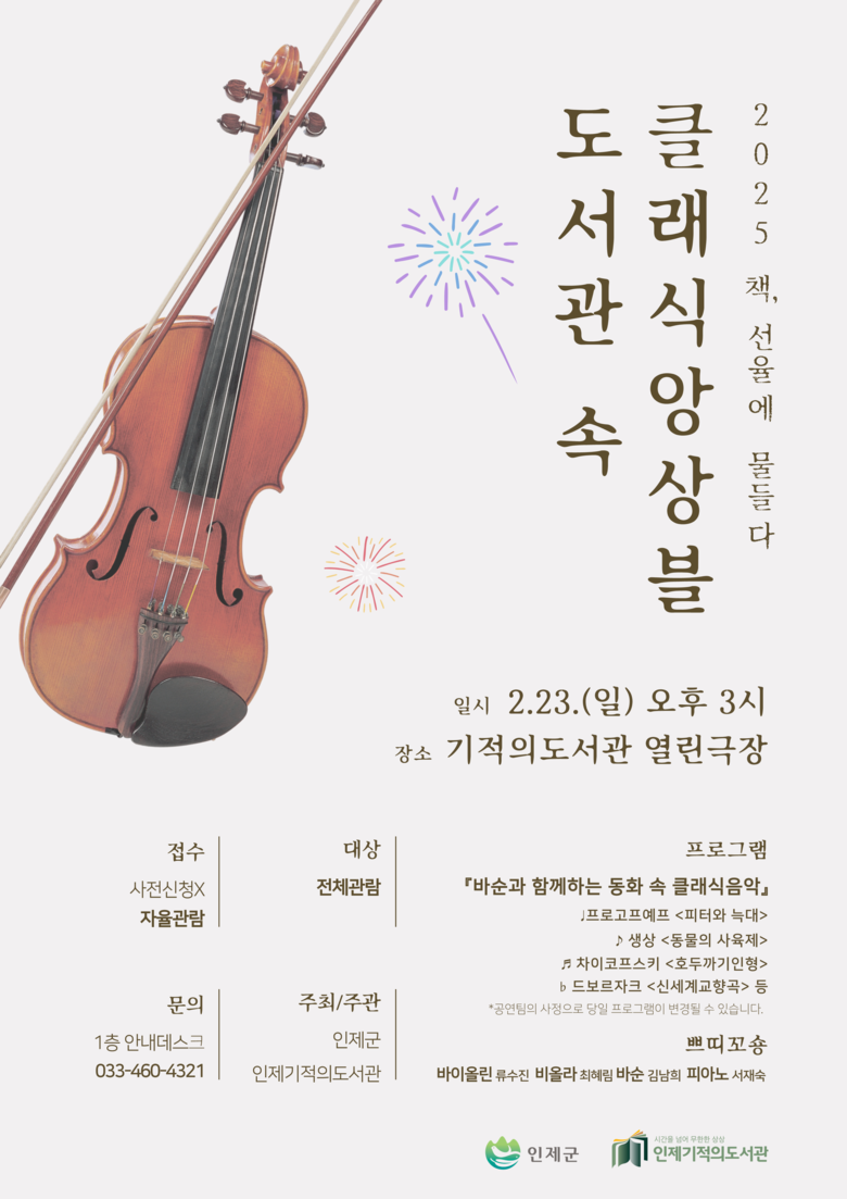 도서관 작은음악회 ‘책 선율에 물들다’는 오는 4월까지 매월 넷째 주 일요일 오후 3시에 기적의도서관, 상남도서관에서 열리며 인제군민이라면 누구나 참여할 수 있다.