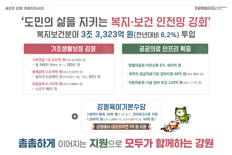 김진태 강원특별자치도지사는 “복지보건 분야에 도 예산의 40%에 해당하는 총 3조 3,323억 원을 투입한다”며, “기초연금은 단일 사업 중 최대 규모로 1조 원 이상을 편성했고, 공공의료에는 1,000억 원, 강원육아수당에는 1,800억 원을 투자할 계획”이라고 밝혔다.