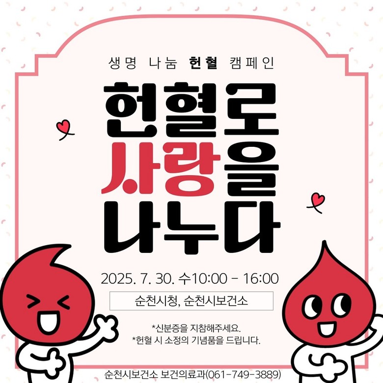 헌혈 관련 문의는 순천시 보건소 보건의료과(061-749-3889)로 하면 된다.