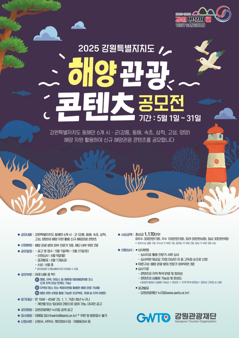 강원관광재단 최성현 대표이사는 “이번 전국 공모전을 통해 해양관광의 새로운 가능성과 지역 자원의 가치를 재조명하길 기대한다”며 “청년들의 창의적인 제안을 적극적으로 응원한다”고 밝혔다.