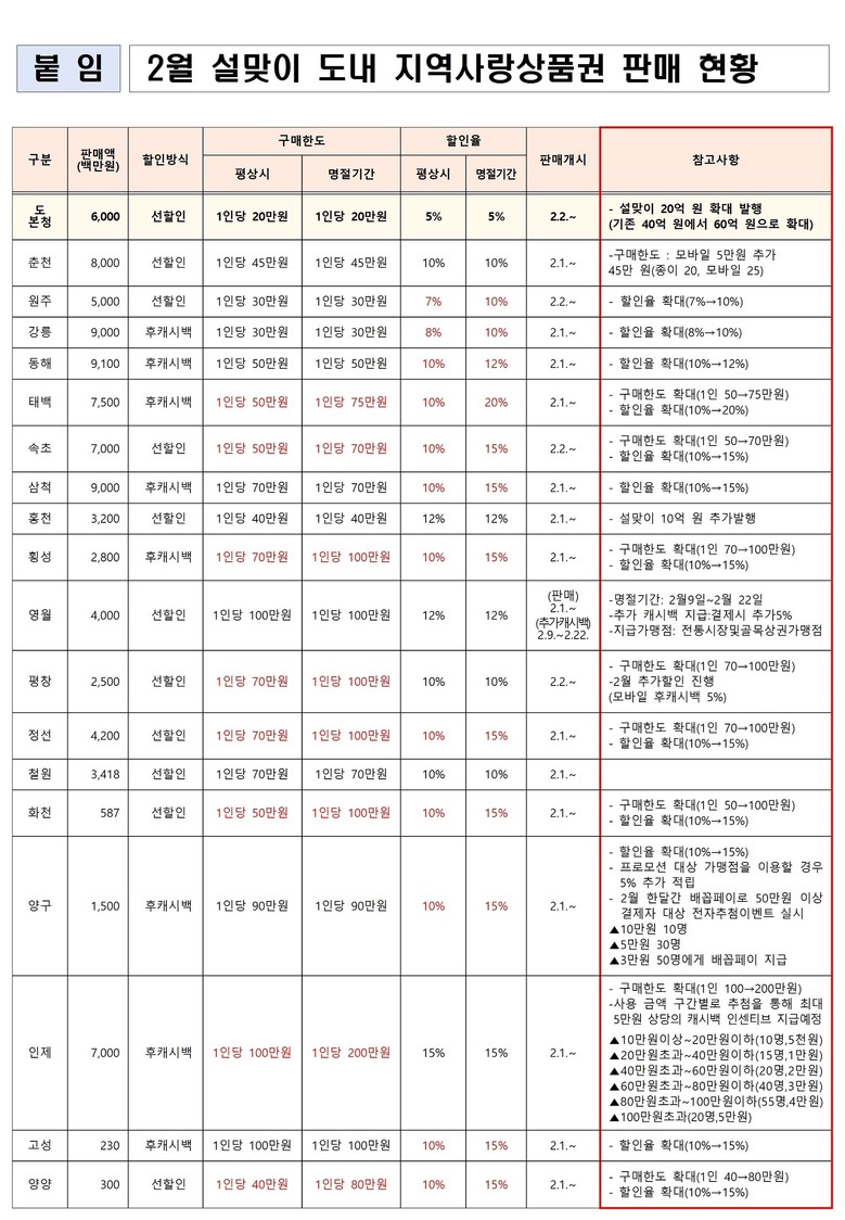 이번 설 명절을 계기로 도에서 발행하는 ‘강원상품권’은 기존 40억 원에서 60억 원으로 확대되며, 5% 할인된 금액으로 1인당 월 20만 원 한도 내에서 구매할 수 있다.
