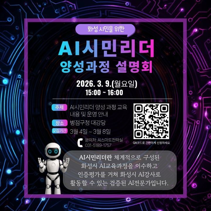 이번 설명회에서는 ‘AI시민리더’ 양성 과정의 운영 체계와 교육 내용, 참여 방법을 안내한다. 아울러 강사 인증 절차와 활동 지원 계획에 대한 상세 설명과 질의응답도 진행될 예정이다. 참여자 모집 기간은 3월 4일부터 8일까지며, 문의는 화성특례시 AI스마트전략실(031-5189-1757)로 하면 된다.