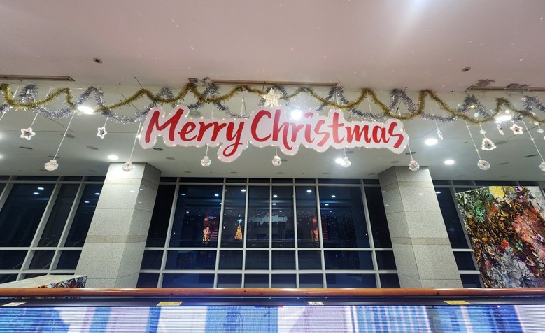먼저 시청사 2층 출입문을 들어서면 화려한 성탄 장식과 함께 은은한 레이저 조명이 어우러져 공간을 가득 채우며, 마치 은하수를 연상케 하는 몽환적인 분위기를 연출해 방문객들의 눈길을 사로잡는다.