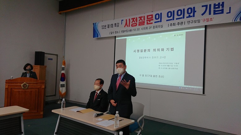 이번 강연회는 정유지 교수(경남정보대학교)가 강연을 맡아 진행하며, 시정질문의 의미와 기능 및 효과를 알아보고 실제 시정질의 사례를 통해 다양한 의견을 나누었다.