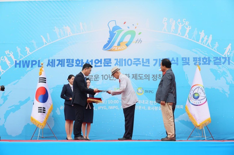 [세계타임즈 = 최준필 기자] (사)하늘문화세계평화광복(HWPL, 대표 이만희)글로벌12지부가 지난 5월 27일 오전 10시 전주시 삼천천 기접놀이전수관 앞 하천변에서 ‘HWPL 세계평화선언문 제10주년 기념식 및 평화 걷기’ 행사를 개최했다.