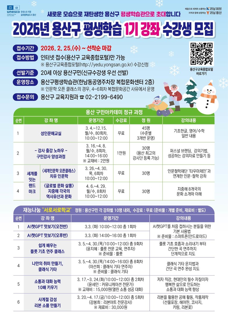 - 2026년 평생학습 1기 강좌 수강생 모집 [용산구 세계타임즈=이장성 기자] 서울 용산구(구청장 박희영)가 새단장을 마친 평생학습관(이태원로 224-19)을 중심으로 ‘배움이 일상이 되는 도시’ 구현에 속도를 낸다.