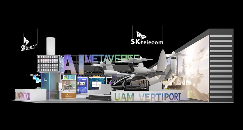 SKT는 MWC23 핵심 전시장인 '피라 그란 비아' 제3홀 중심부에 992㎡(약 300평) 규모의 대형 전시관을 마련하고 인공지능이라는 혁신의 파도가 몰고 올 변화를 주제로 AI, UAM, 6G 등 미래 선도 기술과 서비스를 소개한다.