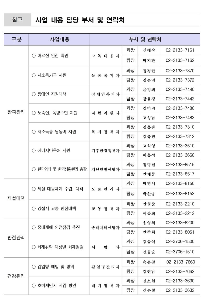한파로 갑자기 생계가 어려워졌거나, 취약한 환경에 거주하는 시민들에겐 생계비(1인가구 73만원)와 의료비(최대 100만원), 10만원 이내 방한용품(전기매트, 침낭 등 방한용품) 등 ‘서울형 긴급복지’를 병행 지원한다. 사회복지시설 및 에너지 취약계층(기초생활수급자, 차상위계층) 2만 3천 가구에 난방물품 등을 지원하는 ‘서울에너지플러스사업’도 진행 중이다.
