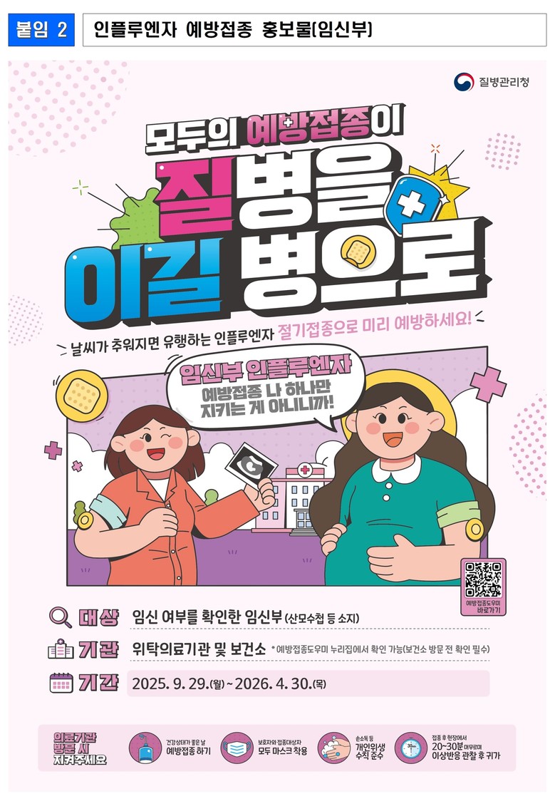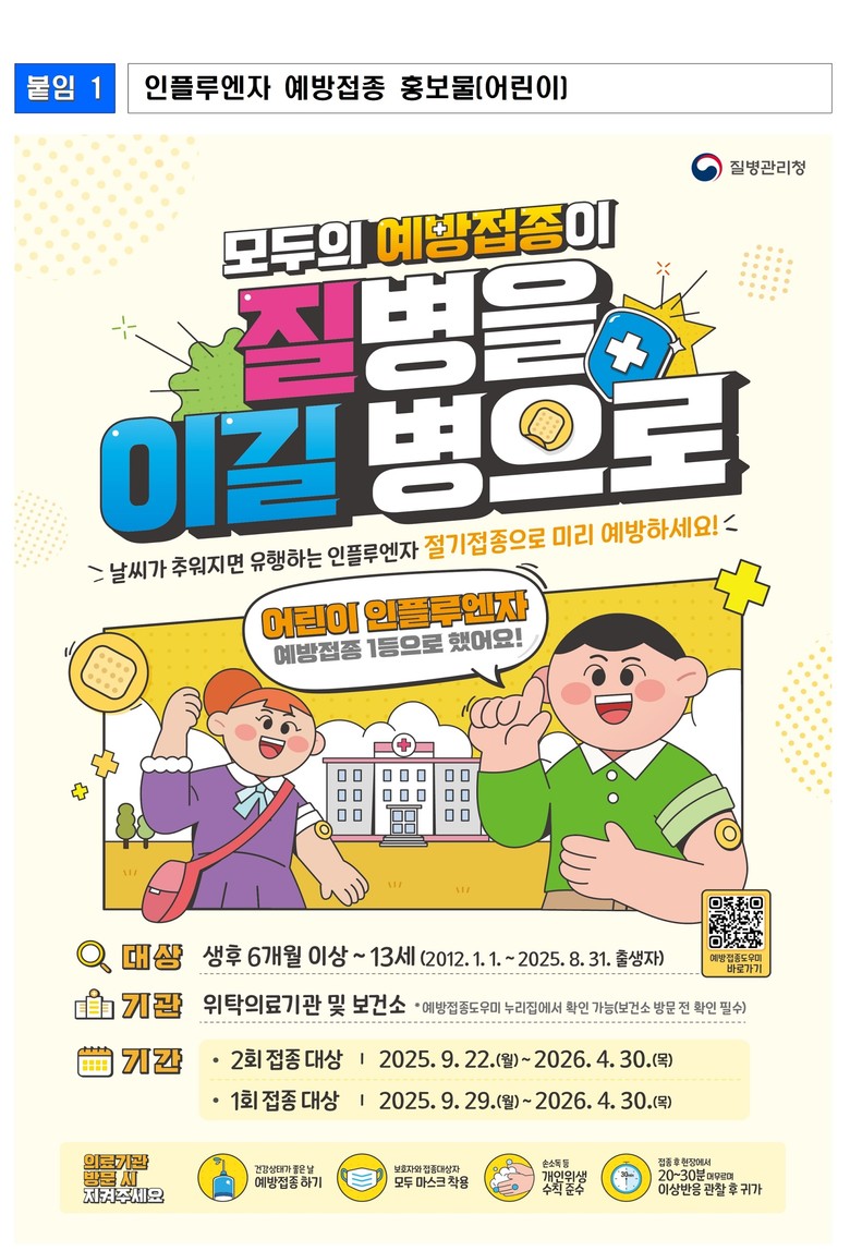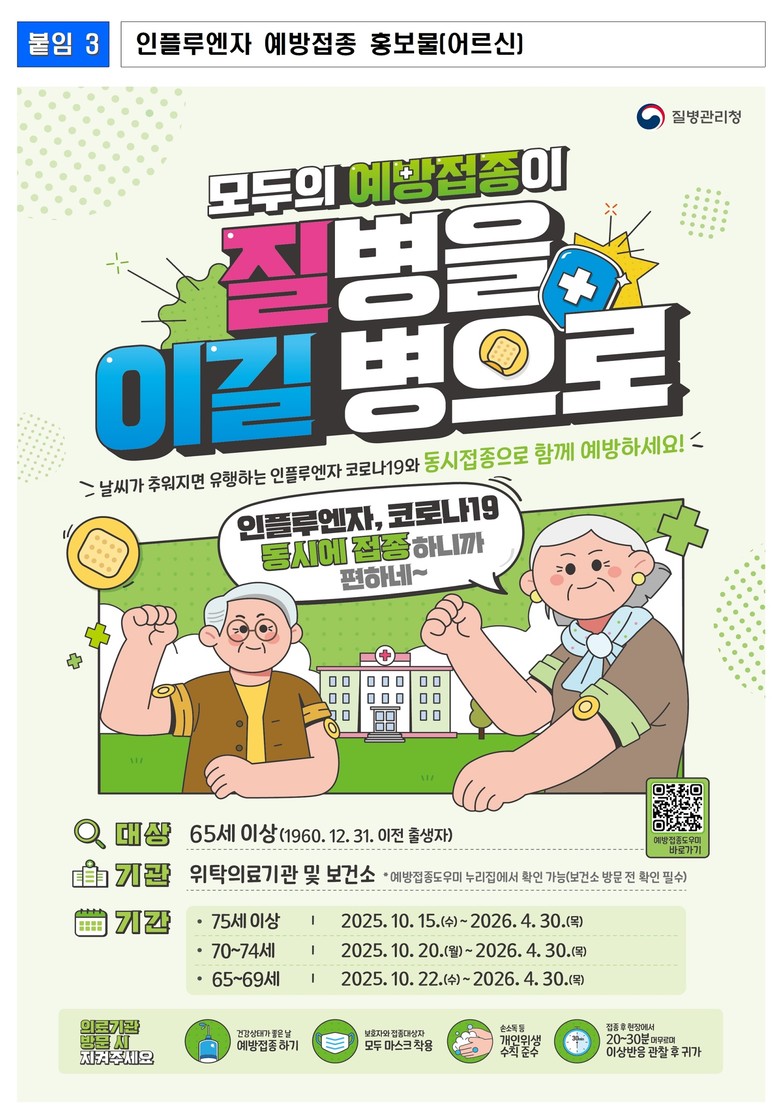 이번 예방접종은 다가오는 겨울철 인플루엔자 유행에 대비하여, 감염될 경우 중증화 위험이 큰 어린이(생후 6개월~13세), 임신부, 어르신(65세 이상)을 대상으로, 기존 4가 백신에서 3가 백신*으로 변경되어 시행된다.