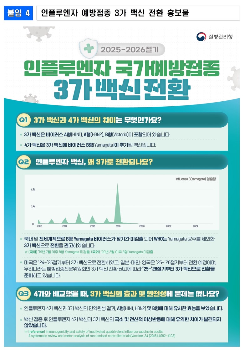 * 4가 백신에서 전 세계적으로 장기간 미검출된 B형 Yamagata 바이러스 항원을 제외한 백신으로 효과성 및 안전성 면에서 4가 백신과 차이가 없으며, 금회 접종부터 전환(붙임 4 참고)