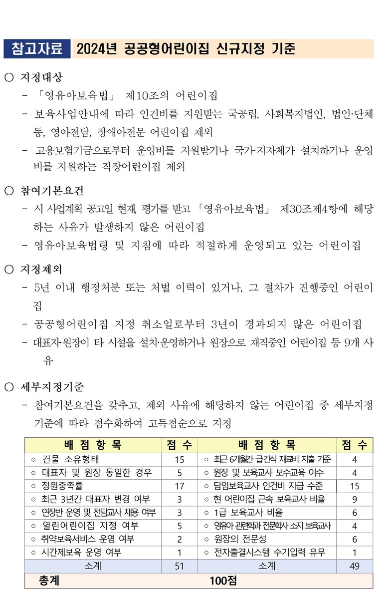 김선자 여성가족과장은 “학부모 선호도가 높은 공공형어린이집을 신규 지정으로 보육서비스 수준을 향상시키겠다”며 “부모가 안심하고 믿고 맡길 수 있는 보육환경 조성을 위해 지속해 노력하겠다”고 말했다.