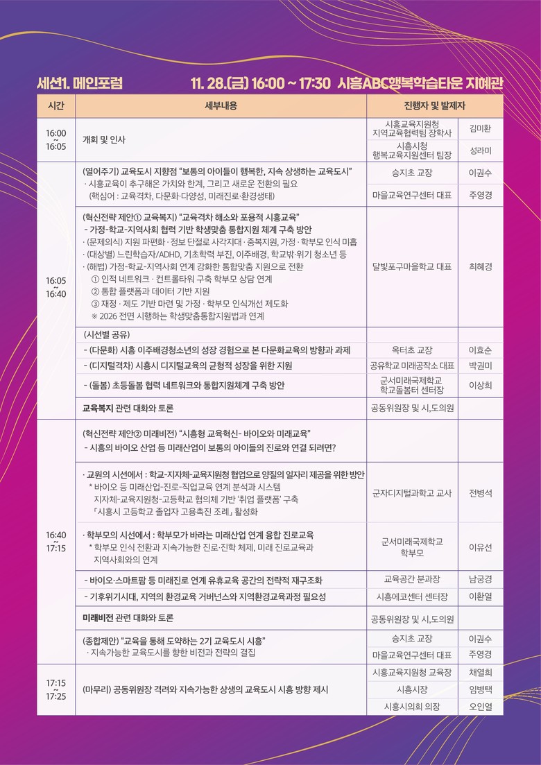 경기도시흥교육지원청은 미래교육의 중심 행복한 시흥교육을 위해 2025년 14개의 포럼 분과를 구성하여 운영하였다. 올해는 각 분과의 논의를 통합해 ‘보통의 아이들이 행복한, 지속 상생하는 교육도시’를 비전으로 제시하며 시흥교육이 축적해 온 가치와 앞으로 나아갈 방향에 대해 논의하는데 목적이 있다.