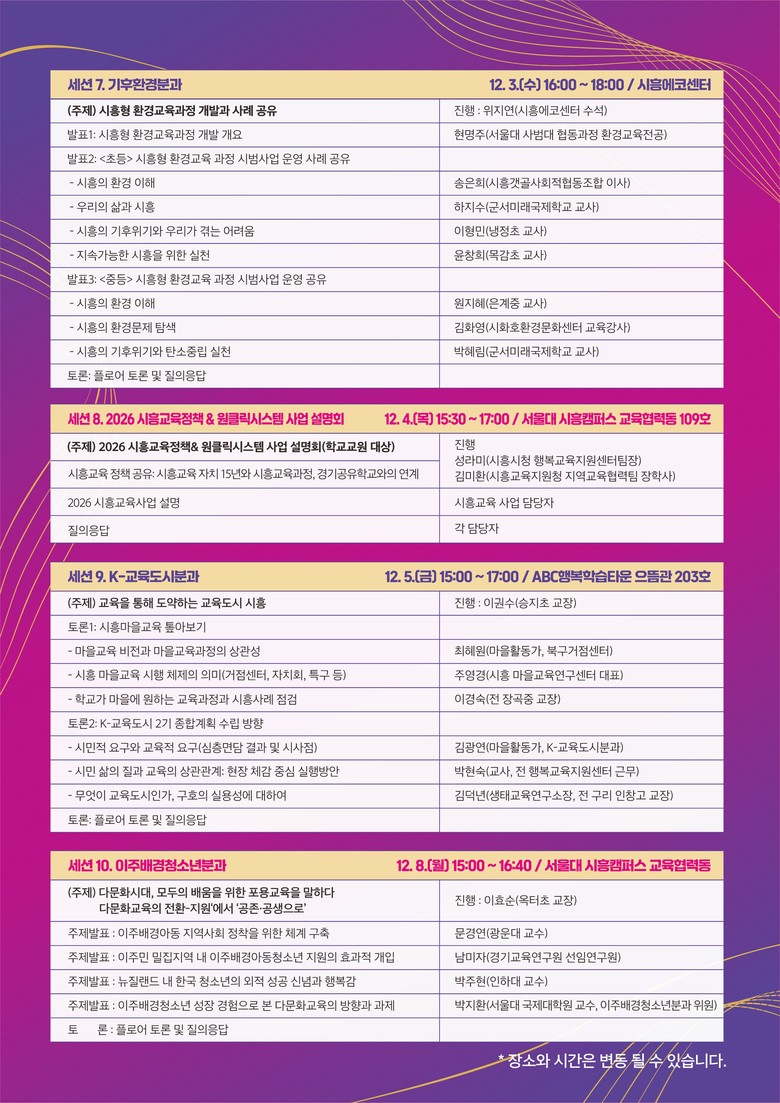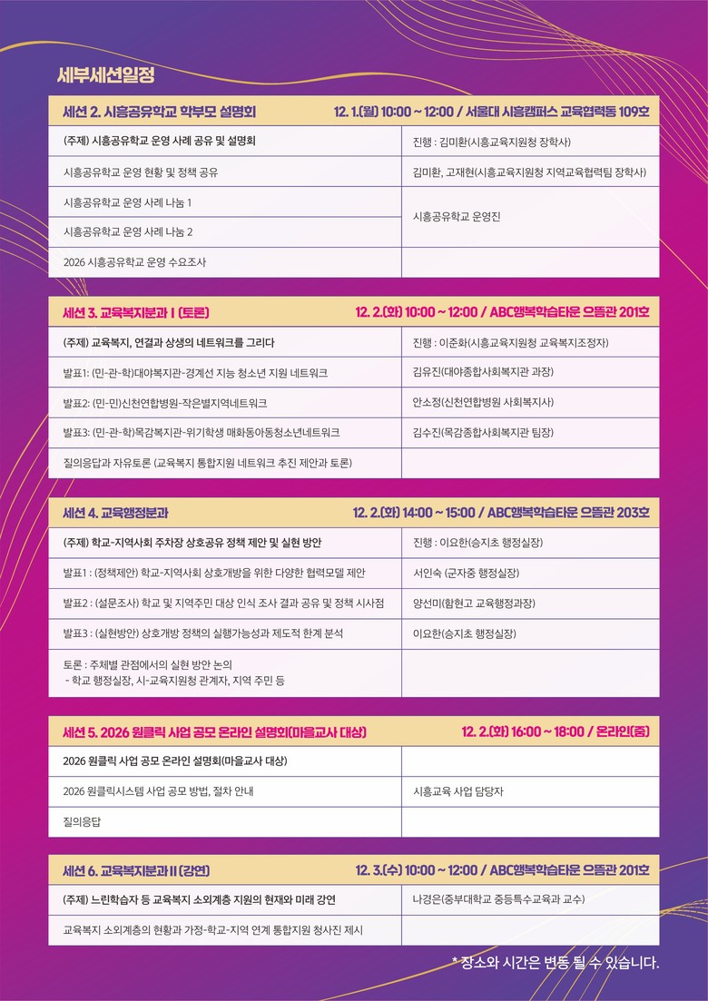세부세션은 ▲교육복지 통합지원 네트워크 추진 방안, 느린학습자 등 교육복지 소외계층 지원의 현재와 미래(교육복지분과) ▲ 학교-지역사회 주차장 상호공유 정책 제안 및 실현 방안(교육행정분과) ▲시흥형 환경교육과정 개발과 사례(기후환경분과) ▲ 교육을 통해 도약하는 교육도시 방안(K-교육도시분과) ▲ 다문화 시대 모두의 배움을 위한 포용교육 방안(이주배경청소년분과)가 진행된다.