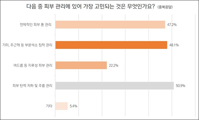 조사 결과, 피부 관리에 있어 가장 고민되는 부분(중복 응답)은 ‘피부 탄력 저하 및 주름 관리(50.9%)’와 함께 ‘기미, 주근깨 부분 색소 침착 관리(48.1%)’가 높은 응답을 보였으며 피부 상태 개선을 위해 가장 관심 있는 미용 제품을 물었을 때(중복 응답) ‘기미 등 부분 색소 침착 개선 제품(50%)’의 응답 비율이 가장 많은 것으로 나타났다.