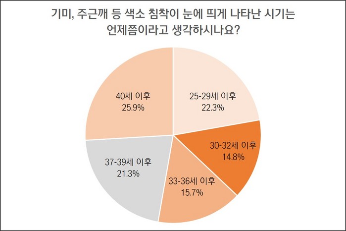 피부 색소 침착 고민 여부를 묻는 질문에 전체 응답자 중 54.7%가 그렇다고 답했다. 특히 연령별 응답을 살펴보았을 때, 20대에서도 관련 고민을 가지고 있다는 답변이 59.2%로 높게 나타난 것은 주목할 부분이다. 또한 전체 응답자를 대상으로 피부 색소 침착이 눈에 띄게 나타나는 시기를 묻는 질문에도 ‘40세 이후에 나타난다(25.9%)’는 응답에 이어 ‘25-29세 사이(22.3%)’라는 응답이 높아 연령에 관계 없이 기미, 주근깨 등 색소침착에 대한 관심이 큰 것으로 조사 됐다.