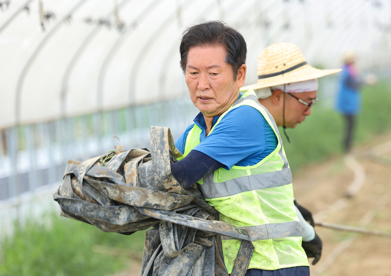 정청래 신임 더불어민주당 대표가 3일 오전 전남 나주시 노안면 오이농가를 찾아 수해 복구 작업을 하고 있다. 2025.8.3