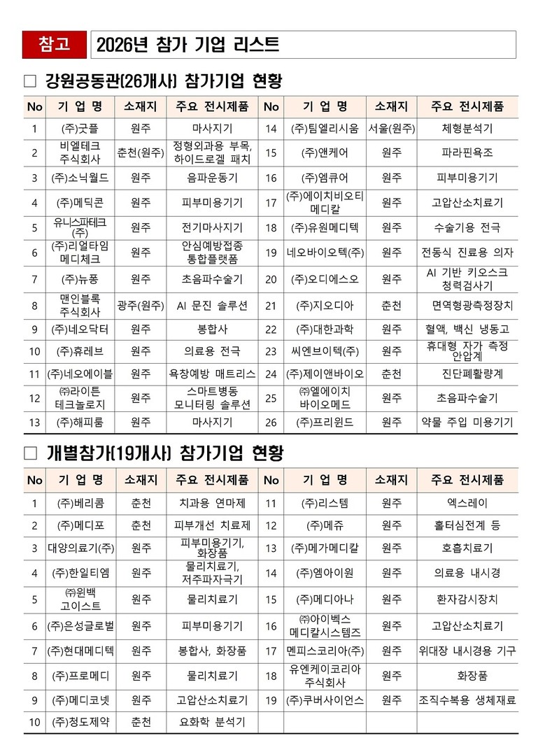 이와 함께 개별 부스로 참가하는 도내 19개 기업도 현장에서 활발한 마케팅과 바이어 상담을 진행하며, 강원 의료기기 브랜드 인지도 제고와 내수·수출 성과 확대에 힘을 보탤 계획이다.