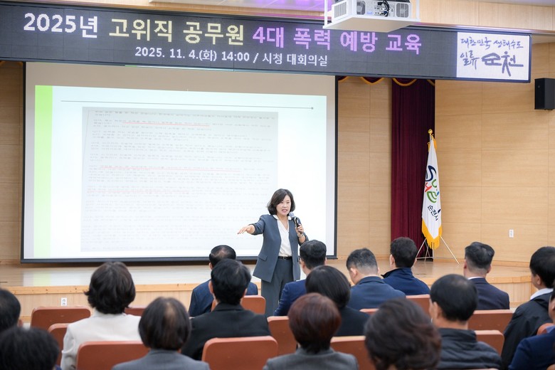 [순천시 세계타임즈=우덕현 기자] 순천시(시장 노관규)는 지난 4일 시청 대회의실에서 기관장 포함 고위직 공무원 100여 명을 대상으로 ‘4대 폭력 통합 예방교육’을 실시했다.