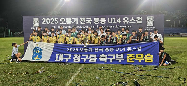 이번 대회에서 주장 남태욱 선수는 우수선수상을, 신호승 감독과 이용우 코치는 우수지도자상을 수상하며 선수들의 기량과 지도자들의 노력이 결실을 맺었다. 청구중 축구부는 올해‘2025 주말리그 대구권역 U14’에서 전승 우승을 기록한 데 이어 전국대회에서도 우수한 성적을 거두며 겹경사를 누렸다.
