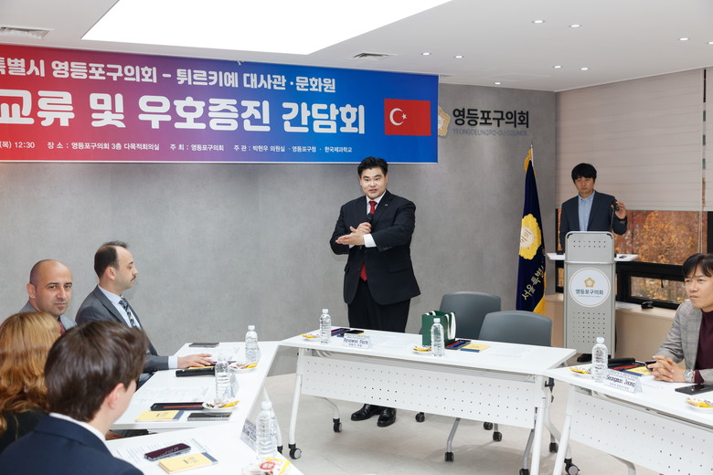[영등포구 세계타임즈=이장성 기자] 서울특별시 영등포구의회 국민의힘 박현우 의원(여의동·신길1동)은 11월 27일(목) 12:30 구의회 3층 다목적회의실에서 이재명 대통령의 튀르키예 국빈방문을 기점으로 지방정부의 ‘공공외교’, ‘문화외교’, ‘보훈외교’ 차원에서 튀르키예 문화교류 및 우호증진을 위한 간담회를 개최했다.