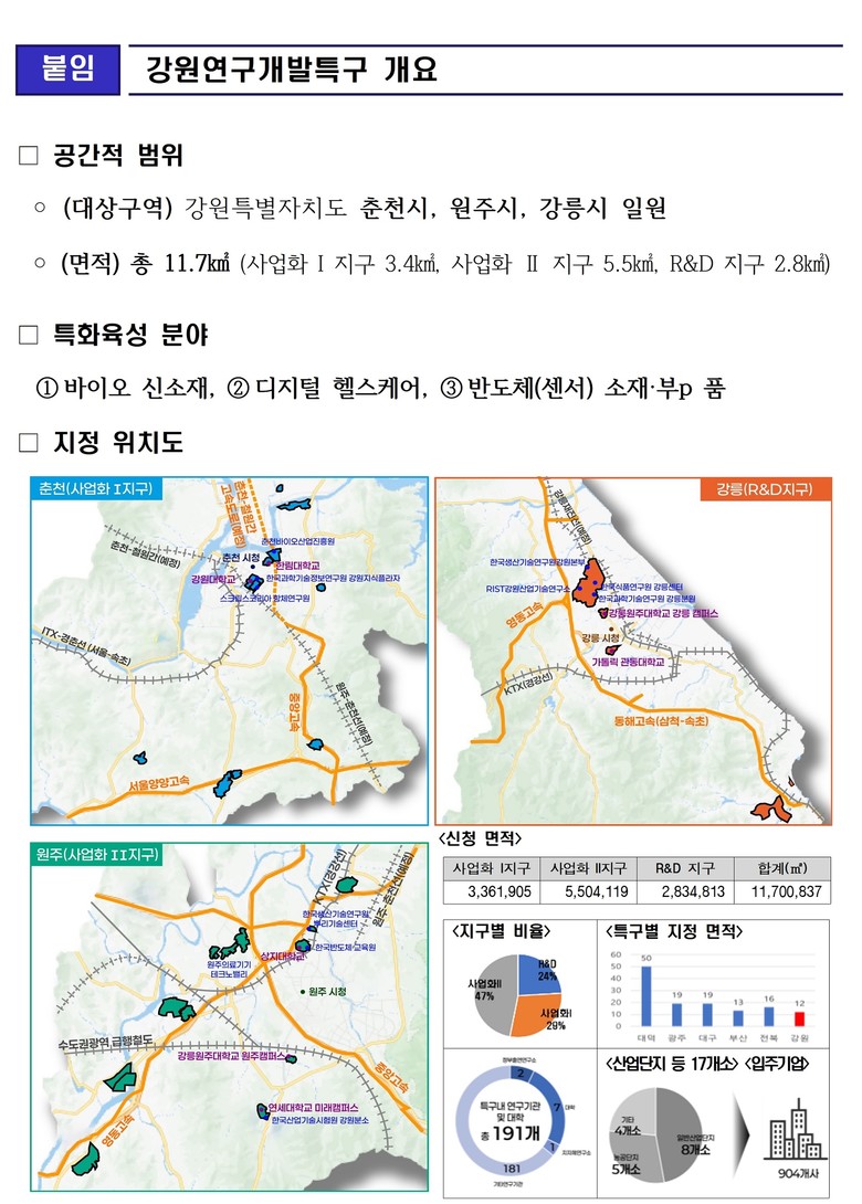 다만 춘천·원주·강릉 개별 도시 단위로는 여전히 지정 요건 충족에 한계가 있었던 만큼 도는 중앙정부와의 협의 과정을 통해 3대 도시의 연구·산업 역량을 하나로 결집하는 연합형 연구개발특구 모델을 제안하였으며 그 결과 이번 신규 지정에 이르게 되었다.