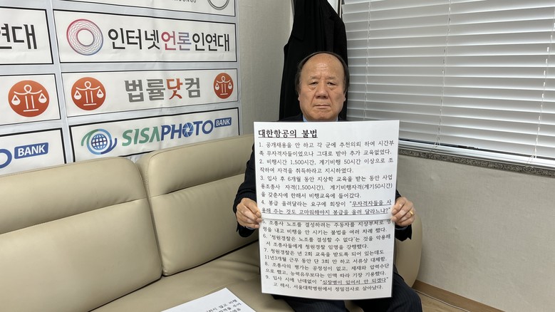 이어 “대한항공은 지난 30년 동안 공개채용 없이 각 군에 추천 의뢰하여 비행시간 1500시간이 부족한 무자격자들을 조종사로 채용했다, 궂은 날 조종사들은 계기판에 의지하는 '계기비행'을 해야 하는데, 계기 50시간을 못 채운 이들이 운항했는데 이 같은 사실이 대법원 확정판결로 확인이 된 것"이라고 주장했다.