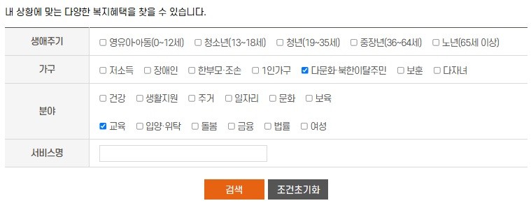 조건으로 본인의 상황이나 관심 사항을 선택하면 그에 맞는 복지서비스를 검색해 준다.