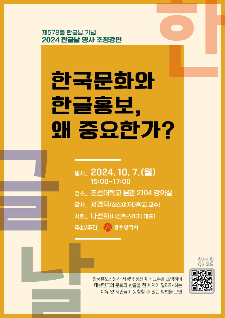 이날 강연은 누구나 무료로 참여할 수 있으며, 광주시 누리집 공지사항에서 정보무늬(QR코드)로 사전 접수하거나 현장에서 신청할 수 있다.