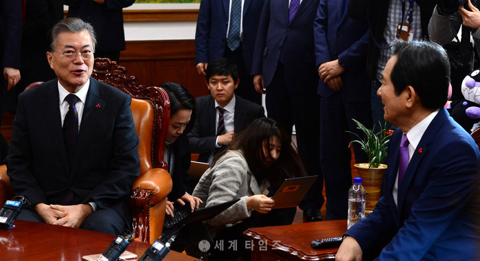 문재인 더불어민주당 전 대표가 2일 오전 서울 여의도 국회의장실을 예방해 정세균 국회의장과 이야기를 나누고 있다