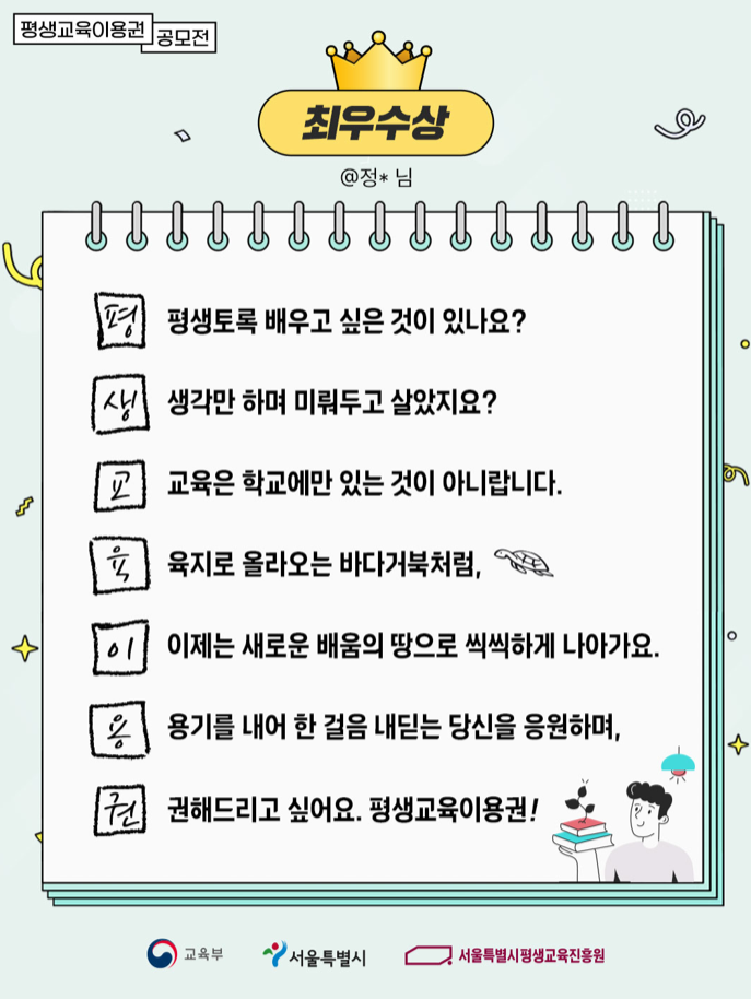 공모전은 ▴학습 수기(서울시 평생교육이용권 이용자) ▴N행시(시민 누구나) ▴기관 우수사례(서울시 평생교육이용권 이용 기관), 3개 분야에 총 421건의 작품이 접수됐으며 함께 진행된 N행시 공모전에는 최우수상 1명, 우수상 1명, 장려상 3명이 선정됐다.