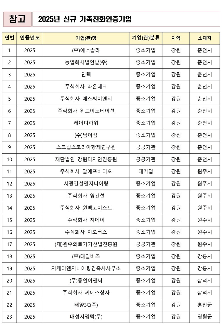 [강원도 세계타임즈=김민석 기자] 강원특별자치도(도지사 김진태)는 12월 1일 성평등가족부가 발표한 「2025년 가족친화인증기업·기관」 선정 결과, 도내 23개 기업·기관이 신규 인증을 획득했다고 밝혔다.