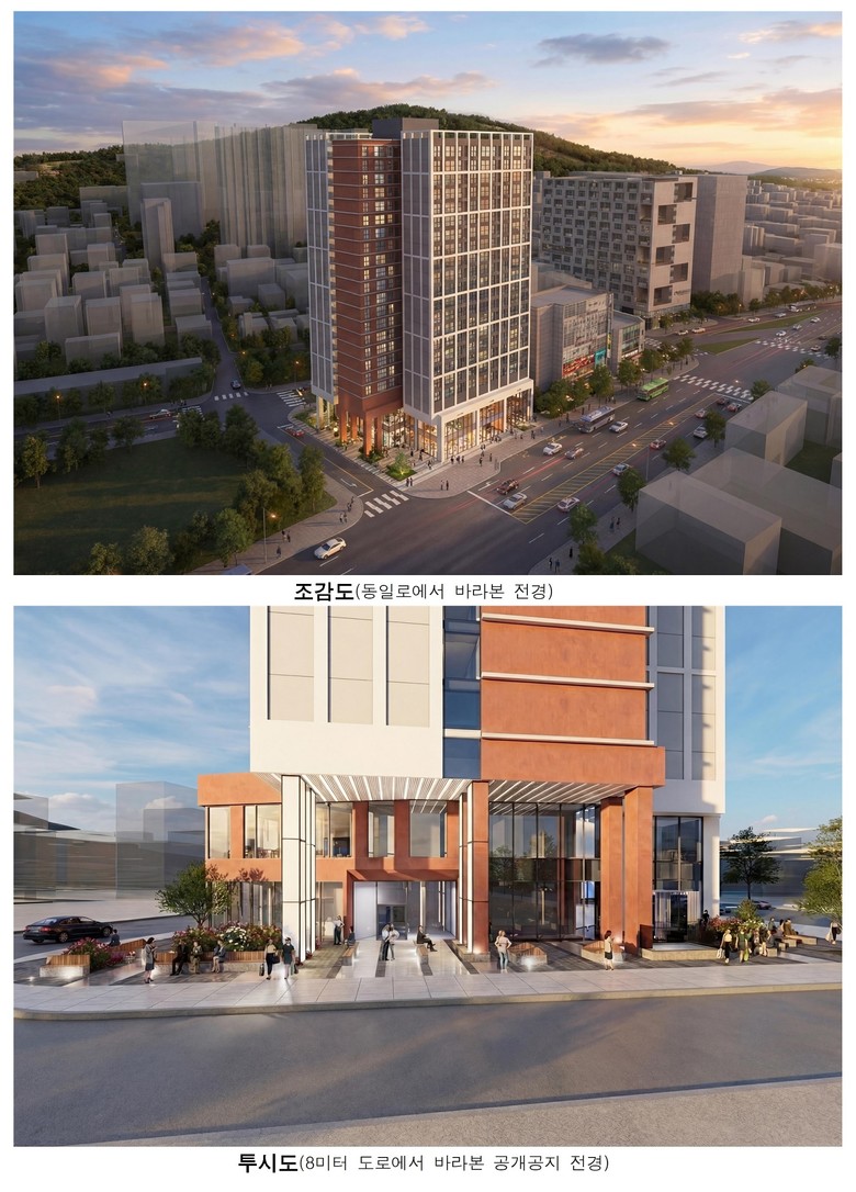 중랑구 묵동 먹골역 인근엔 지하 5층·지상 21층 규모 복합시설이 들어선다. 공공임대 오피스텔 152실과 함께 저층부에 근린생활시설 약 1,300㎡가 조성된다.