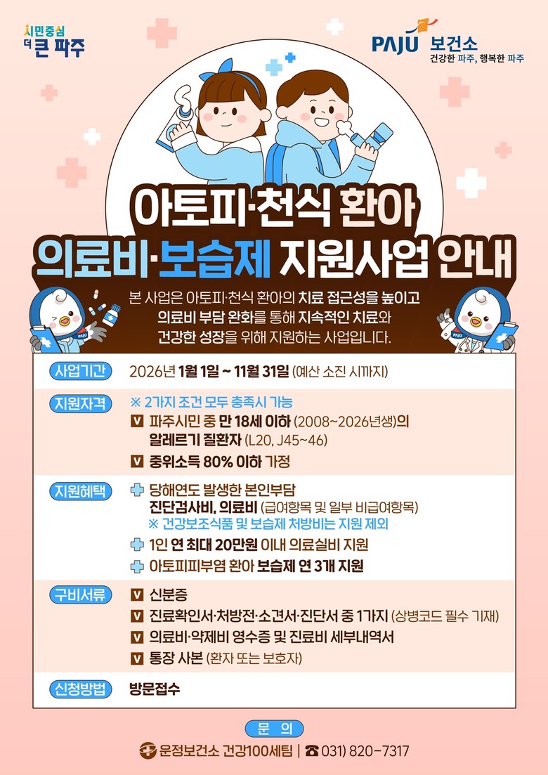 ‘의료비·보습제 지원사업’은 관내 중위소득 80% 이하 가정의 아토피·천식 환아(2008년생~2026년생)를 대상으로 하며, 진료비 일부와 보습제를 지원해 증상 악화 예방 및 지속적인 관리를 돕고 있다.