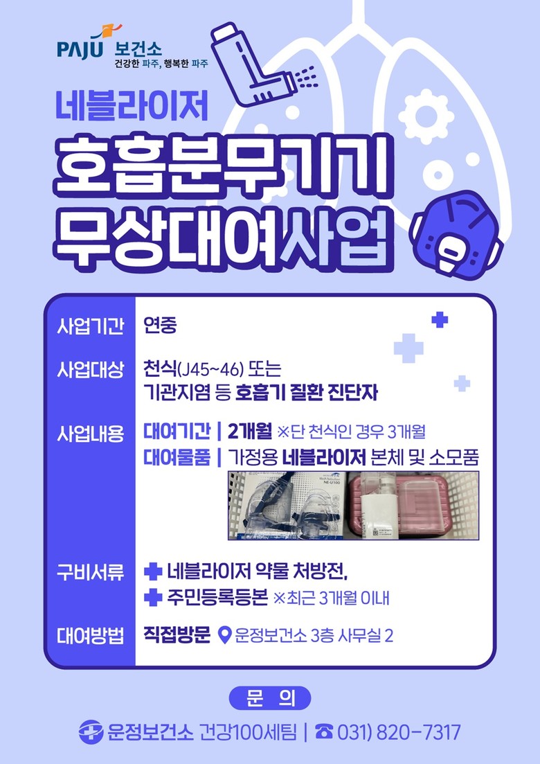 이와 함께 천식 및 기타 호흡기 질환으로 분무 요법 치료가 필요한 파주시민을 대상으로 ‘호흡분무기기(네블라이저) 무상 대여사업’도 운영해, 가정에서도 안전하고 편리하게 치료를 이어갈 수 있도록 지원하고 있다.