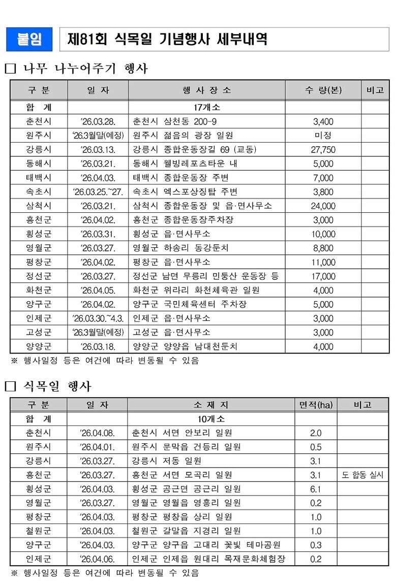 아울러 제81회 식목일을 맞아 3월 27일부터 4월 8일까지 도내 전역에서 식목행사를 추진하고, 나무심기 참여 분위기 확산에 나선다.