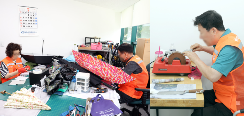 | ▲ 사진은 '동작 맥가이버센터' 근무자들이 우산 수리와 칼갈이를 하고 있는 모습. |