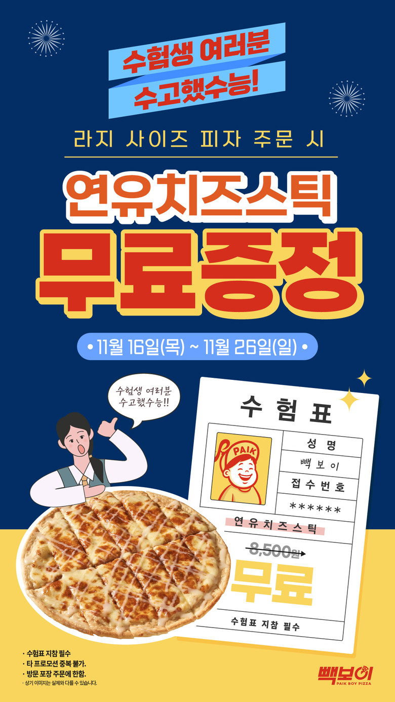 빽보이피자는 오랜 시간 수능을 준비하느라 고생한 수험생들을 격려하고, 달콤한 결과만이 남아 있기를 기원하는 마음으로 통 큰 프로모션을 기획했다. 16일부터 26일까지 매장에서 수험표 인증 후 라지사이즈(L사이즈) 피자 구매 시 8,500원 상당의 ‘연유치즈스틱’을 무료로 제공할 예정이다.