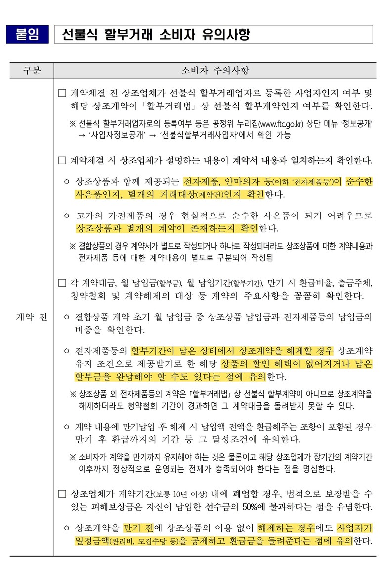 특히 사업자는 결합상품을 홍보하고 계약을 체결하는 과정에서 ▲광고 위탁·제휴 업체를 대상으로 준법사항에 대한 교육을 철저히 하여 향후 유사한 위반행위를 방지하기 위한 시스템을 구축하는 한편, ▲상조·여행 계약과 가전제품 계약이 별도의 계약이라는 점을 사전에 소비자에게 명확히 안내하는 것이 필요하다고 강조했다.