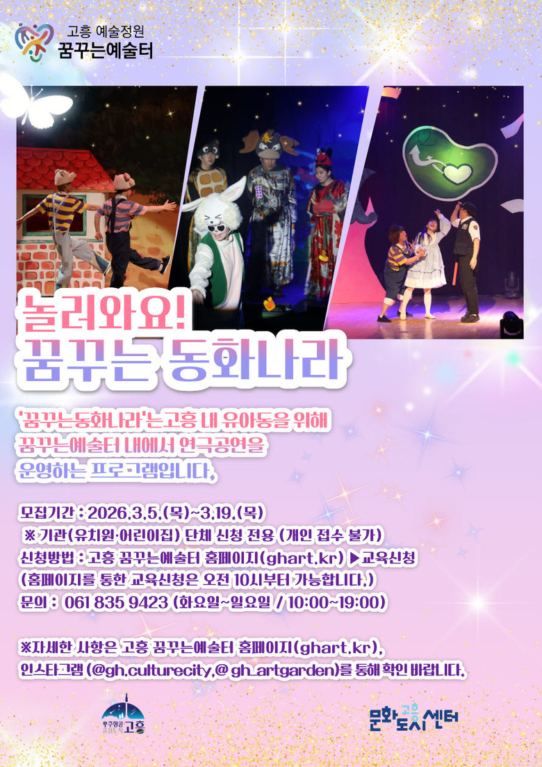 특히 이번 프로그램은 유치원과 어린이집 단위의 단체 관람으로만 운영되며, 개인 신청이나 개별 관람은 불가하다. 관람을 희망하는 관내 교육기관은 모집 기간 내 고흥 꿈꾸는예술터 홈페이지(ghart.kr)를 통해 신청하면 된다.