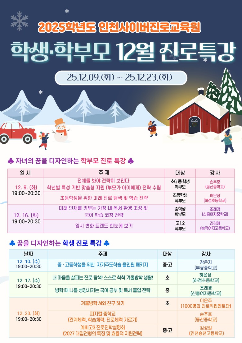 학생 대상 특강은 겨울방학을 성장 기회로 삼을 수 있도록 초등학생 ‘겨울방학 생활 계획’과 ‘AI와 친구하기’, 중학생 ‘국어 공부 및 독서 전략’과 ‘학습·진로 체력 기르기’, 예비 고3 ‘2027 대입 전형 분석’ 등 학년별 주제를 다룬다.