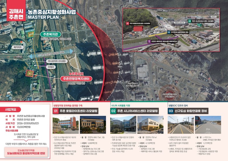 김해시는 농촌중심지활성화사업 기본형으로 선정되었으며 주촌면행정복지센터가 구도심에서 신도심으로 이전하여 공실로 남겨진 구 주촌면행정복지센터를 리모델링하여 부족한 아동 및 청장년층의 문화.복지 서비스 향상과 김해시의 다양한 문화, 예술활동가들과 주민 동아리 활동을 지원하는 공간으로 조성하는 주촌로컬라이프센터 리모델링(45억 원)을 지원한다.
