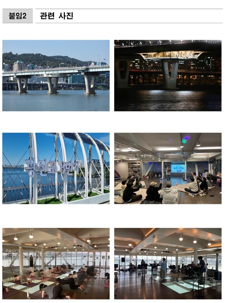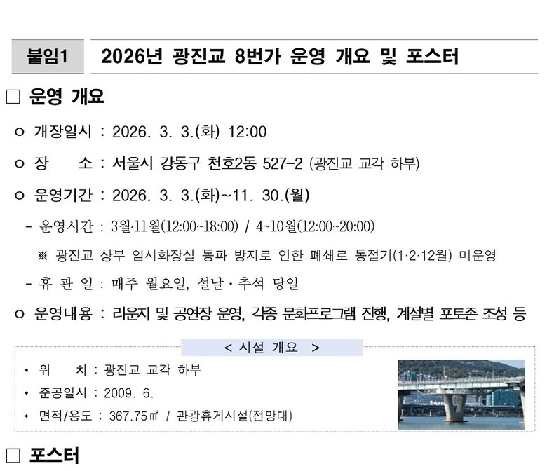 음악공연, 요가 클래스 등 문화프로그램 진행 소식과 기타 안내 사항은 광진교 8번가 공식 누리집(www.riverview8.co.kr)과 SNS 채널(www.instagram.com/riverview.8)에서 확인할 수 있다.