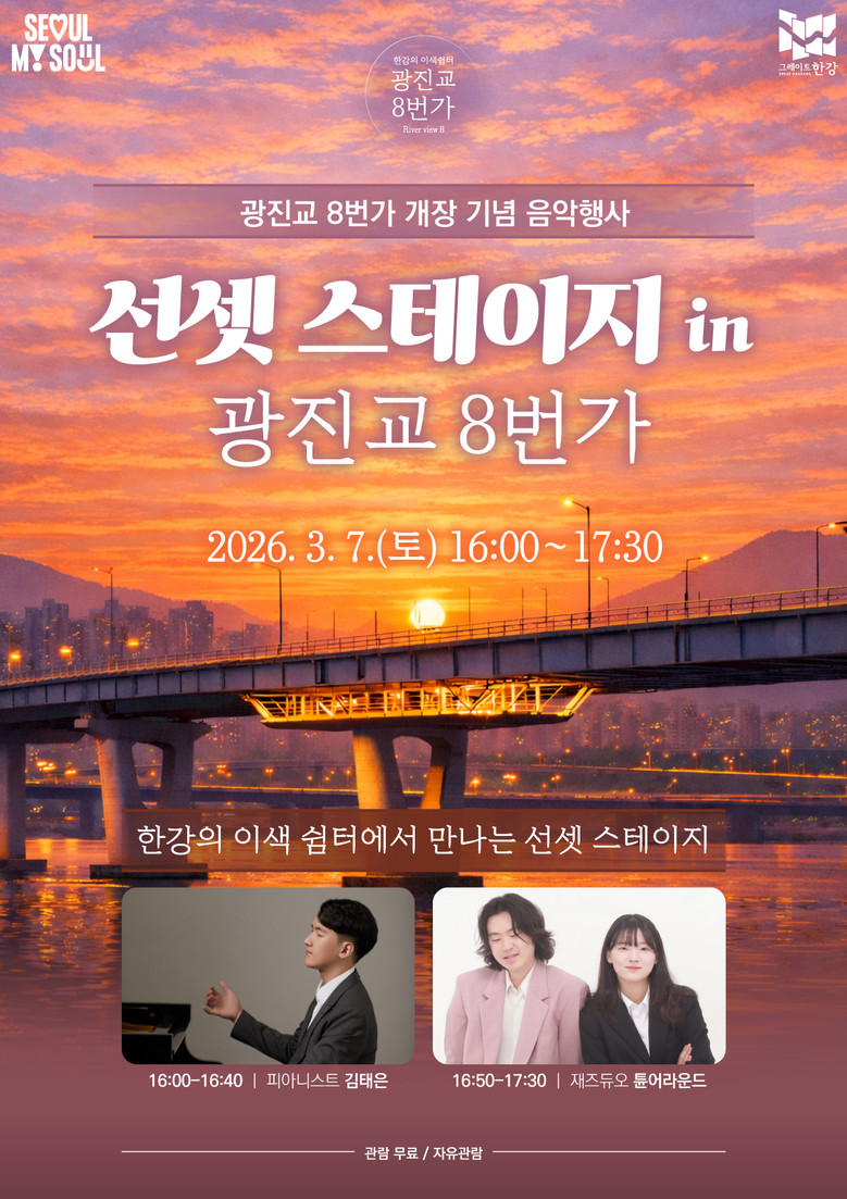 한편 서울시는 광진교 8번가 개장을 기념해 오는 7일(토) 음악공연 ‘선셋 스테이지 in 광진교 8번가’를 개최한다. 16시부터 17시 30분까지 진행되는 이번 공연은 피아니스트 김태은과 재즈밴드 튠어라운드가 무대에 올라 클래식, 팝재즈 등 다양한 감성 연주를 통해 색다른 음악적 경험을 제공한다.