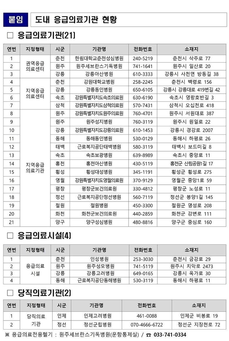 박송림 강원특별자치도 복지보건국장은 “설 연휴 기간 동안 병·의원과 약국이 차질 없이 운영되도록 빈틈없는 비상진료체계를 유지해 도민과 방문객 모두가 안전한 명절을 보낼 수 있도록 최선을 다하겠다”고 밝혔다.