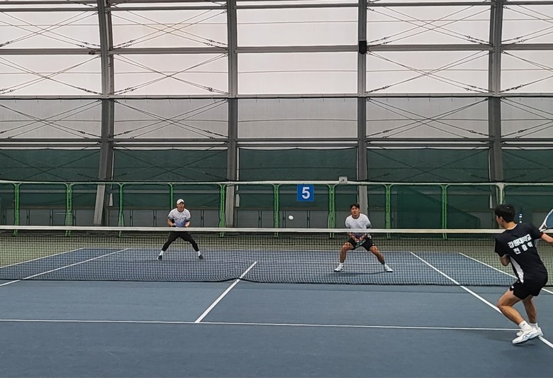 | ▲ 지난 3일 순천시청팀(좌측부터 이하늘, 류태우)이 순천에서 열린 2026년도 소프트테니스 국가대표 최종선발전에서 경기하고 있다 |