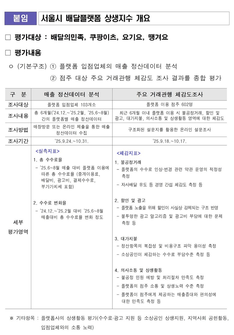 - 입점업체 매출 정산데이터 조사, 점주의 체감도 설문조사 통해 배달플랫폼 상생수준 진단