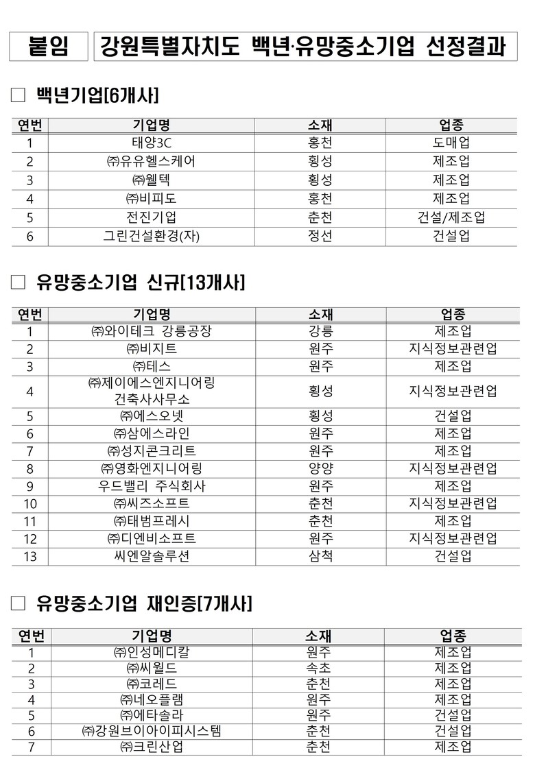 ‘백년기업’은 2012년부터 흔들림 없는 경영 철학과 사회적 책임을 바탕으로 지역 경제와 사회 발전에 본보기가 되는 장수기업을 대상으로 선정하고 있으며, ‘유망중소기업’은 2003년부터 혁신적 기술력과 성장 잠재력을 갖춘 기업을 발굴해 강원 경제의 미래를 이끌어갈 핵심 주역으로 육성하고 있다.