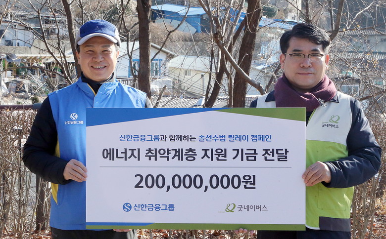 1차 캠페인인 ‘사랑의 연탄 나눔’을 위해 임직원들이 모금한 약 1억5천만원과 신한금융그룹의 기부금을 더해 총 2억원의 성금을 마련했다. 이 성금은 굿네이버스를 통해 난방비 지원과 함께 약 3만5천장의 연탄 및 난방용품을 한파에 어려움을 겪고 있는 에너지 취약계층 400여 가구를 위해 전달할 예정이다.