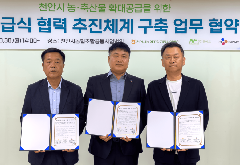 이번 업무협약을 통해 CJ프레시웨이는 식자재 유통 인프라를 기반으로 천안시농협조공법인과 거래하고 있는 천안 지역 단체급식소의 질 향상과 건강한 식문화 조성에 나선다. 단체급식 전문 기업 ‘엔에프’와도 협력해 안정적인 급식 운영을 지원하기로 했다.